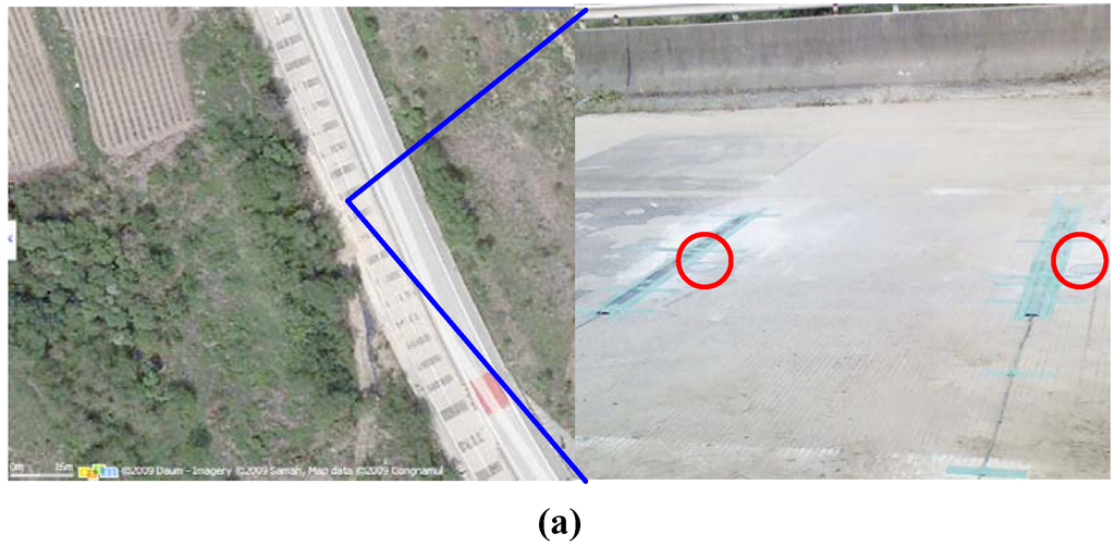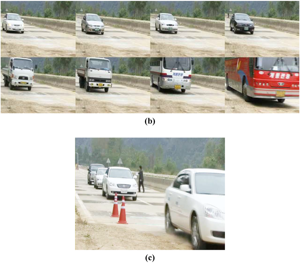 Old highway testbed. (a) Old highway testbed and deployed switching tape and two T-Sensor-v nodes (red circles). (b) Eight vehicles among the nine vehicles used on 12 Oct. in 2007. (c) Four vehicles used on 13 Oct. in 2007.