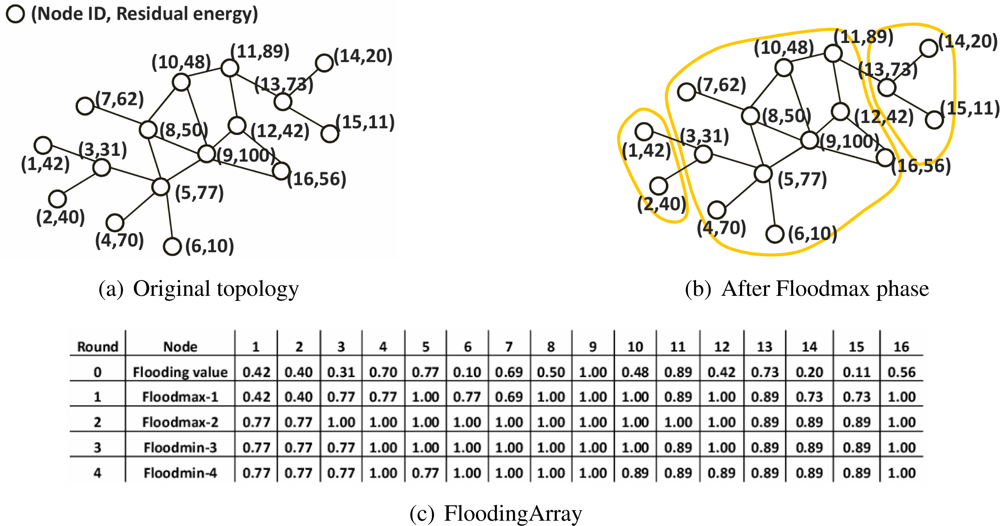 Figure 1 shows a demonstration of Floodmax and Floodmin. Figure 2(a) presents the network topology with 16 nodes. For simplicity, it is assumed that the weight factor (ω) is 1 and the initial energy of each node is 100. Each node records the 0th element in FloodingArray by computing the flooding value using its residual energy and degree. In the case of node 3, the residual energy is 31, thus the flooding value is 0.31 according to Equation (1). In Floodmax-1, each node chooses the largest value among its own flooding value and the flooding values of 1-hop neighbors and records the selected flooding value as 1st element in its FloodingArray. Node 3 selects the highest value, 0.77 among 0.31, 0.42, 0.40, and 0.77, the flooding values in the 0th round of node 3 and its neighbors 1, 2, 5, respectively. In Floodmax-2, 1.00 is selected as the maximum value among its own flooding value and the flooding values of neighbors in Floodmax-1. Figure 2(b) shows the groups of nodes that select the same flooding value in Floodmax-2. Among the 16 nodes, 11 nodes select the highest flooding value in Floodmax-2, 1.00. Floodmax is a greedy algorithm and may result in an unbalanced load for the cluster heads. However, using Flood-min, we can evenly distribute the flooding values selected in Floodmax-d to the overall network. In Floodmin-3, each node selects the minimum value among the flooding value of the neighbors including itself in Floodmax-2. Node 3 selects 0.77 in Floodmin-3 and the same number in Floodmin-4. Nodes 3, 5, and 11 regain the flooding value of 0th round or the flooding value in Floodmax-1 by Floodmin.
