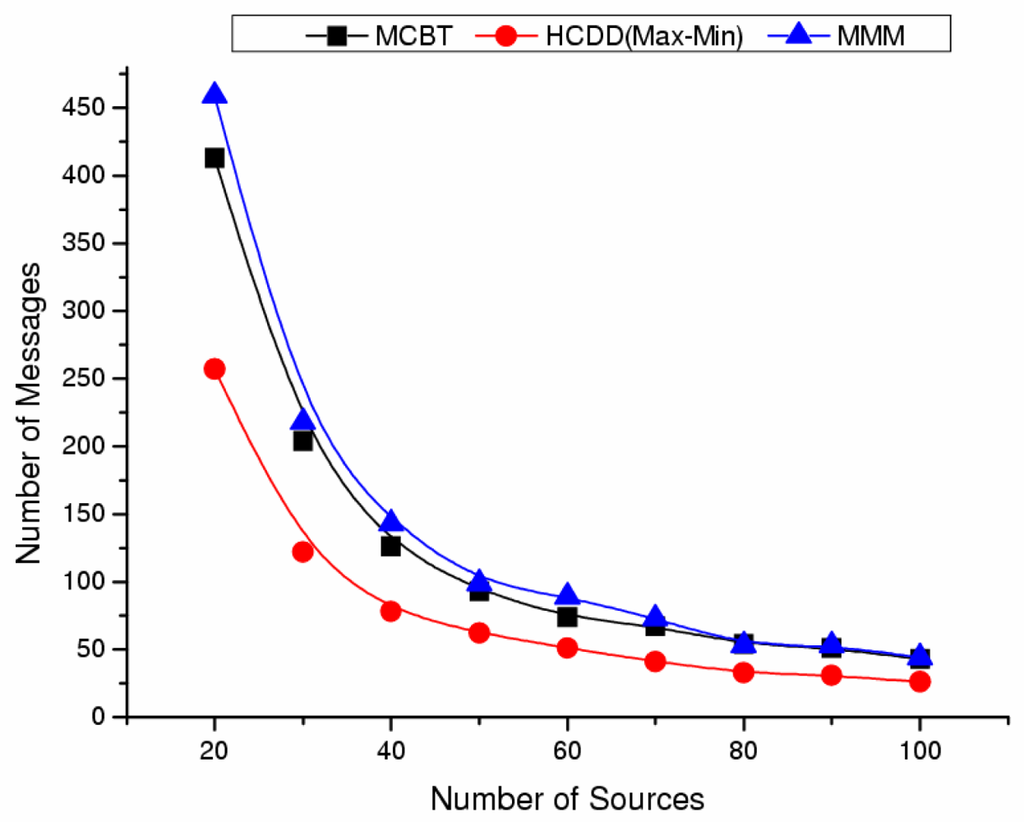 Figure 10 shows the maximum number of transmitted messages from source to sink before reconstruction of the backbone at different number of sources. The maximum number of transmitted messages is the performance metric to show the network lifetime indirectly. If the path differs for the same source and sink, the time can be affected by network conditions, such as collisions and delays. Therefore, the maximum number of transmitted messages, excluding those factors, is appropriate to measure the network lifetime. As the number of sources increases, the performances of MCBT and other schemes decrease. MMM performs 11% better when the number of sources is small. However, as shown in Figure 10, when the number of sources increases, the difference between MCBT and MMM becomes negligible. The good performance of MMM is due to the selection of cluster heads with a high degree. This provides load distribution among nodes around the cluster head, so the loss of energy due to packet forwarding is decreased. Moreover, the degree based algorithm such as MMM provides high connectivity. Even when the path used at the first time gets disconnected, it will be able to use another path. Therefore, the maximum number of transmitted messages is high. However, by managing the weight factor, MCBT can select nodes with higher degree as the cluster heads, which reflects the advantages of MMM. MCBT appropriately considers both important factors (residual energy and degree) based on system conditions. In addition, MCBT has better time complexity than MMM as shown in Table 1.