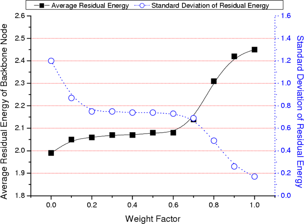We simulate our algorithm to confirm that the backbone is composed of nodes with higher energy and degree. The parameters of the simulation are shown in Table 2 of Section 4. Figure 3 shows the results of the average and standard deviation of the backbone nodes’ residual energy as the weight factor changes. As the weight factor approaches 1, the weight of the nodes’ residual energy increases and the average residual energy of the backbone nodes also increases (solid line in Figure 3). As the weight factor approaches 1, nodes with higher residual energy are selected as cluster heads in advance and the distribution of residual energy among backbone nodes is even (dotted line in Figure 3). Figure 4 shows the average and standard deviation of degree of backbone nodes as the weight factor changes. As the weight factor approaches 0, the weight of the node’s degree increases and the average degree of the backbone nodes also increases (solid line in Figure 4). As the weight factor approaches 0, the nodes with higher degree are selected as cluster heads in advance. The distribution among degree of backbone nodes could be even (dotted line in Figure 4).