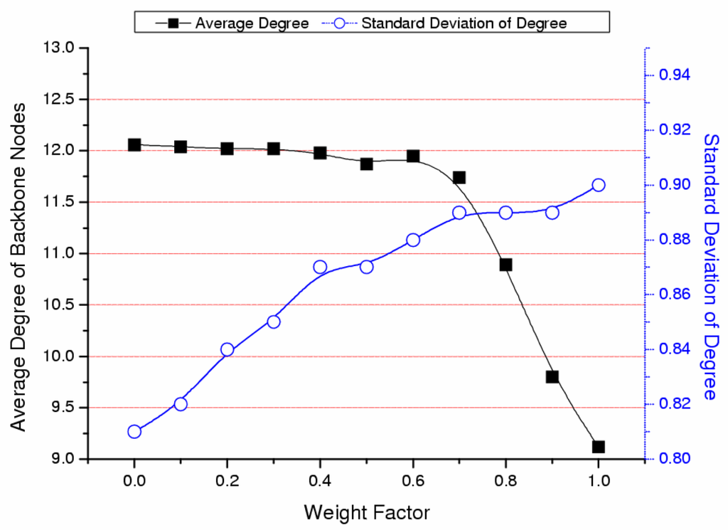 - Average residual energy or degree of backbone nodes:The residual energy or degree of the backbone nodes shows the stability of the backbone. The demands on the backbone nodes are larger than those of ordinary nodes and nodes around the cluster head consume more energy in order to forward packets. However, by selecting a node with higher energy or degree, the high energy consumption of specific nodes should be alleviated.