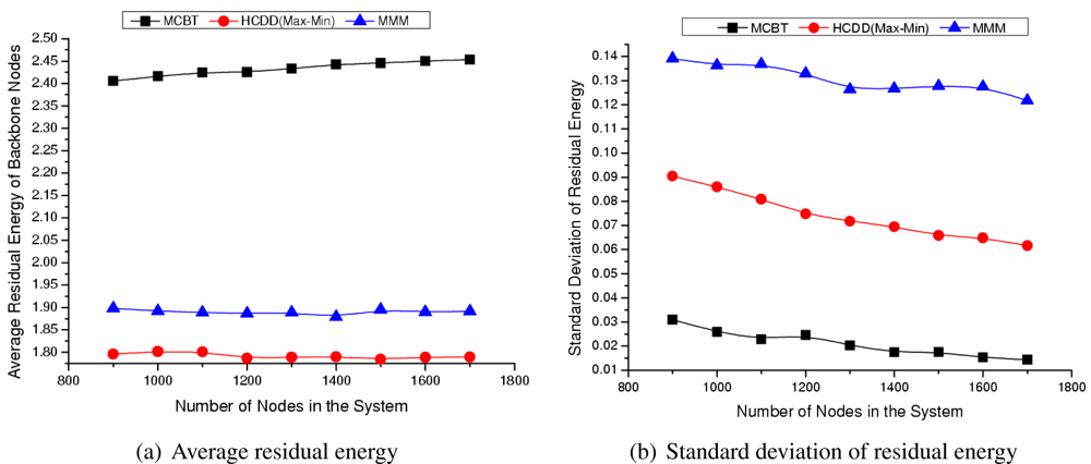 Figure 6 shows the average and standard deviation of the backbone nodes’ residual energy as the number of nodes changes. As shown in Figure 7(a), regardless of the number of nodes composing the network, MCBT (ω = 0.7) maintains the highest residual energy. The backbone nodes’ average residual energy of MCBT, MMM, and HCDD are 2.43 J, 1.89 J, and 1.79 J, respectively. MCBT exhibits 22% and 26% improvement respectively, compared with MMM and HCDD. Considering that the backbone nodes have greater demands in terms of packet transmission than those of the ordinary nodes, we can form a stable backbone by selecting nodes with higher residual energy as cluster heads. The standard deviation describes the difference in residual energy among backbone nodes as shown in Figure 7(b). MCBT selects nodes with higher residual energy as cluster heads in advance, so it has a low standard deviation, averaging around 0.01 ∼ 0.03 J.