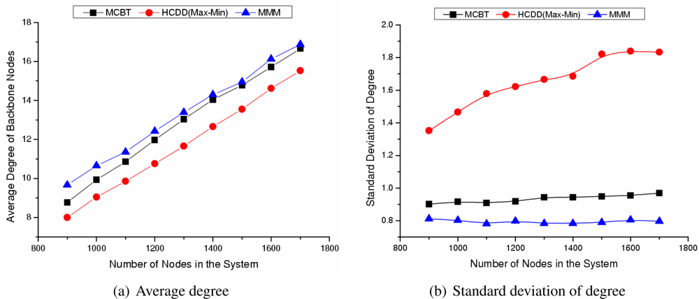 Figure 7 shows the average and standard deviation of degree of backbone nodes as the number of nodes changes. In Figure 8(a), when the number of nodes increases, the network density also increases, thus the average degree of the backbone nodes increases. The range among degree of nodes is not high, so the average degree of each algorithm is similar. MMM always performs well, since it forms the backbone by taking into account the node degree. The average degree of backbone nodes of MCBT is similar to that of MMM because MCBT (ω = 0.7) considers both degree and energy. If we set ω to 0, MCBT has a similar value to MMM. As shown in Figure 8(b), the standard deviations of degree of backbone nodes in MCBT and MMM are very small values, such as 0.93 and 0.79. Nodes around the cluster head consume more energy than nodes located far from the cluster head, since they frequently transmit packets to the cluster head. However, if we select the nodes with high degree as cluster heads, we could distribute the packet forwarding load among nodes around the cluster head, and thus extend the network lifetime.