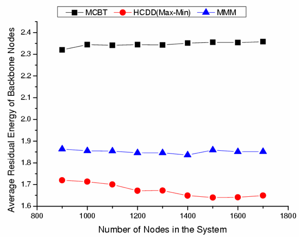 Figure 8 shows the average residual energy of backbone nodes after 30 sources initiate 20 events periodically. It appears to be a similar graph to that of the average residual energy in the early phase of backbone construction (Figure 7(a)). Therefore, we know that the stability of the backbone of MCBT is maintained after data transmission.