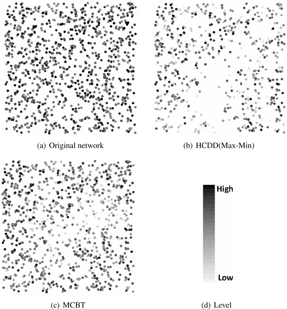 Figure 9 shows the remaining energy of nodes when 30 sources initiate 40 events periodically. The lighter color of the node denotes a lower residual energy. HCDD has large differences in terms of residual energy between, before, and after event occurrence, compared with MCBT. This means the backbone of HCDD is composed of nodes with low energy. Thus, HCDD has many backbone nodes that exhaust energy when many events occur, which causes network disconnection.