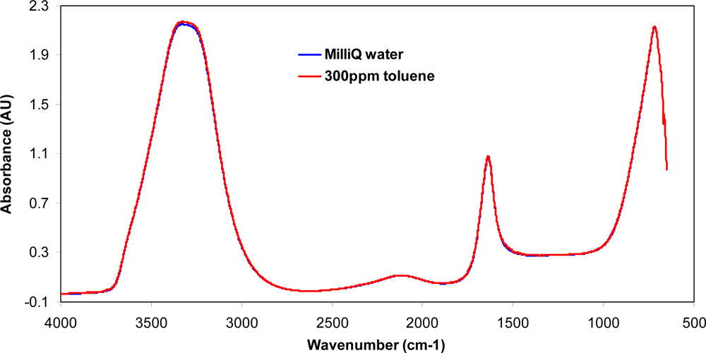 Comparison of the mid-infrared spectra of a ZnSe IRE exposed to MilliQ water in the absence and presence of 300 ppm toluene.