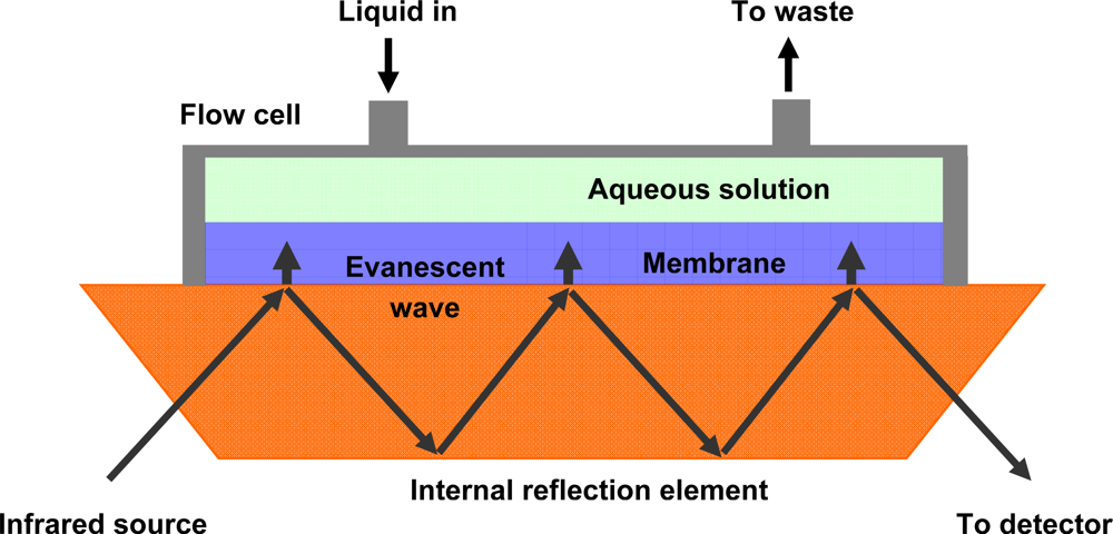 It has been shown recently that the detection of low levels of hydrocarbons in aqueous solutions by ATR-FTIR is viable provided that the surface of the IRE is chemically modified with an appropriate material, noting that this concept is based on solid-phase microextraction [25]. A membrane that is less than 50 μm thick is placed directly onto the IRE and Figure 3 shows a typical sensor configuration / experimental setup. A thin layer is used to ensure rapid and reversible response and by tailoring the chemical properties of the membrane it can be made to preferentially interact with certain hydrocarbon compounds. Usually, the coated IRE is placed in a flow cell which comprises a peristaltic or piston pump to deliver the aqueous solution to the sensing surface. Analyte molecules are extracted into the film and equilibration is achieved more rapidly when the aqueous solution is flowed across the surface. In most environmental studies the components are constructed of stainless steel in order to minimize analyte adsorption onto the walls of the flow cell. Detection is commonly achieved with a liquid-nitrogen cooled mercury-cadmium-telluride (MCT) photoconductor, which monitors the infrared radiation that passes through the IRE. Other detectors are available in the MIR range (i.e., triglycine sulfate pyroelectric detector, etc), however, the MCT detector is generally preferred since it is more sensitive [11].