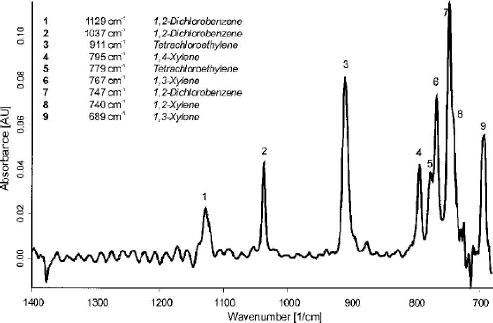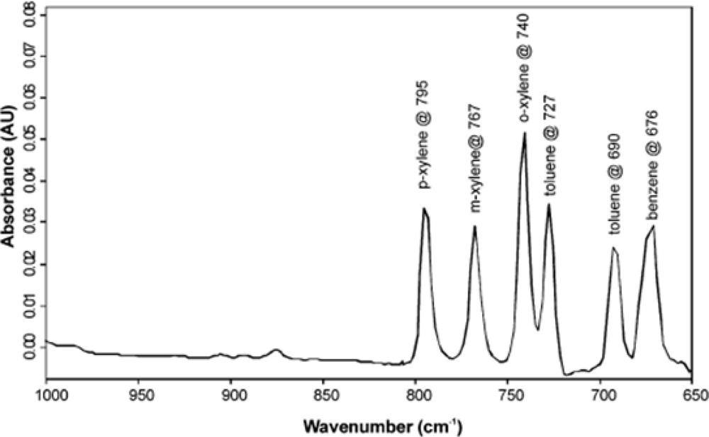 Although, a number of sensors have been developed over the past several decades to directly measure BTEX levels in water, many of them are unsuitable for environmental monitoring since they struggle to clearly resolve and separate the signals arising from the various aromatic components (i.e., benzene, toluene, ethylbenzene and xylene). Their similar structure and chemical properties presents a significant challenge for signal discrimination which cannot be easily accomplished by employing a selective membrane or pattern recognition/multicomponent analysis methods. However, the MIR-ATR sensor is able to easily overcome the problem of limited selectivity by resolving the total hydrocarbon signal according to their individual characteristic infrared absorption frequencies. Recently, Mizaikoff and coworkers developed a MIR-ATR sensor based on a ethylene-propylene copolymer and managed to simultaneously distinguish between 5 compounds (i.e., benzene, toluene, p-xylene, o-xylene, and m-xylene) in less than 20 min [20]. Figure 4 displays the IR spectrum of the compounds at 500 ppb levels, noting that the peaks are well resolved and separated. The ability to perform multianalyte detection using characteristic IR frequencies is an attractive feature of the MIR-ATR sensor.