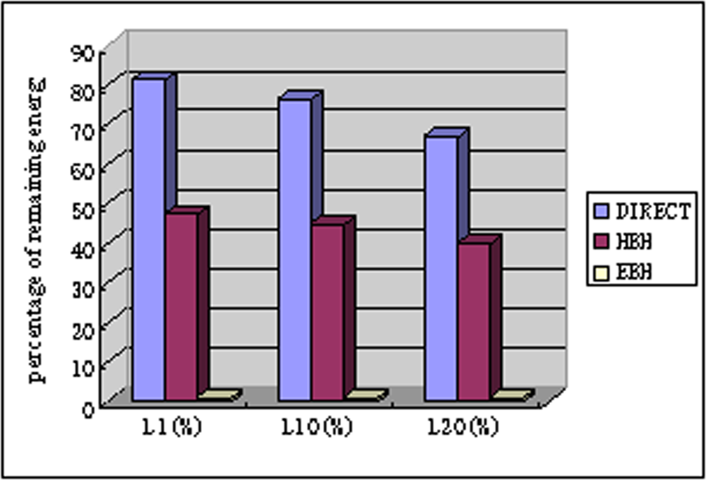 In Figure 10, we compare the average remaining energy per node with different lifetime definitions of networks. We compare EBH with DIRECT and HBH. The node number is 20 and the internode distance is 100 m. The energy grades m = 45 computed by Equation (15). We have modified the DIRECT algorithm where each node has the ability transmitting data directly to the sink in order to compute different lifetime of the network. The figure shows that DIRECT has the highest energy wasted, all above 60% remaining energy with three different lifetime definitions. HBH wastes less energy than DIRECT but higher than EBH. EBH has less than 2% energy wasted for all three lifetime definitions.
