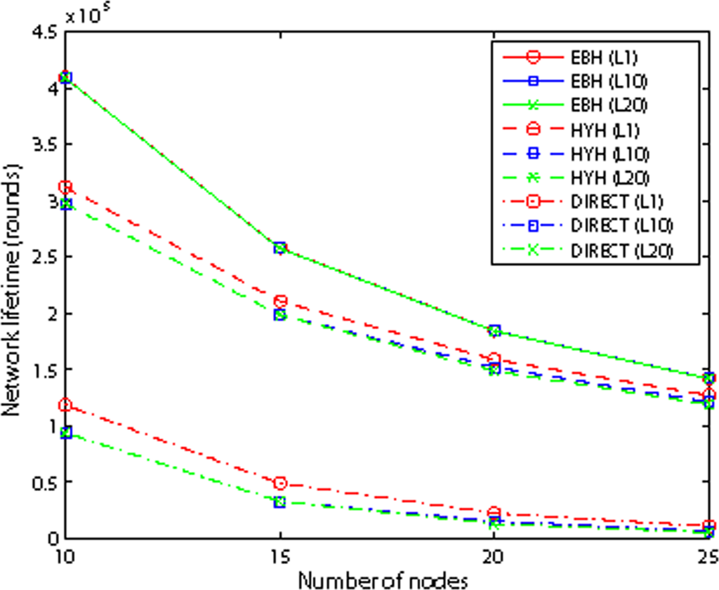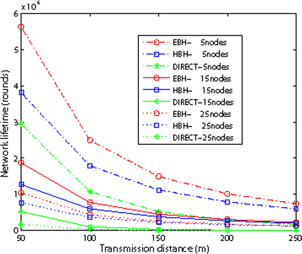 Figure 11 shows the network’s lifetime for different schemes. We vary the node number from 10 to 25, and the internode distance is 100m. Observed from the Figure 11, the networks’s lifetime of three algorithms decreases as the number of nodes increases. The DIRECT’s lifetime is determined by the farthest node from the sink. So, as the number of nodes increases, the farthest node has longer distance which decreases the network’s lifetime. As to HBH, the node nearest to the sink determines the lifetime of network. That means, as the node number increases in the network, the node nearest to the sink will relay more packets which lead to decrease of the network’s lifetime. Because of EBH is a hybrid transmission scheme of DIRECT and HBH, the network’s lifetime decreases as the number of nodes increases in the network. We also observe that with different lifetime definitions, the lifetime of EBH is almost the same. The reason is that as each node dissipates energy evenly in EBH, they are out of function almost at same time. The figure also shows that EBH gives the best performance with different number of nodes, because it combines the advantages of both DIRECT and HBH.