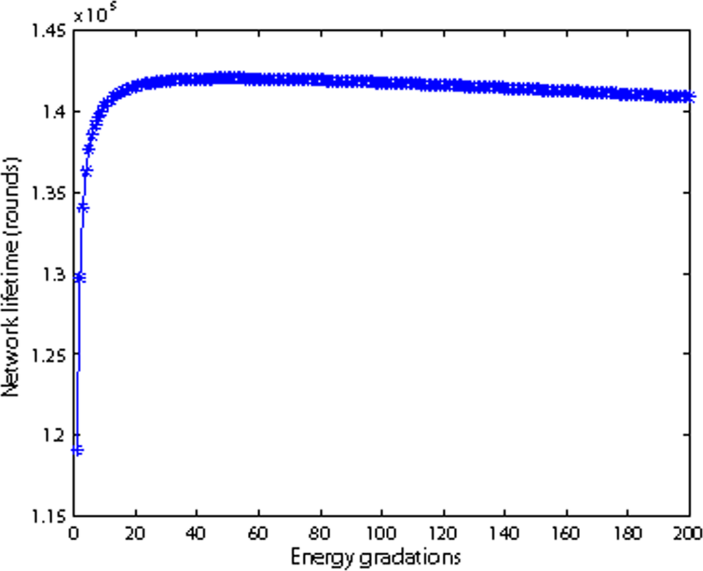 Figure 13 shows the relationship between energy grades m and network lifetime. The total number of nodes is 20 and r is 100 m. From Figure 13, we observe that the network lifetime increases rapidly when the energy grades initially increase; then there is a section of area where the network lifetime is more or less constant. Finally in the last sectors, the network lifetime decreases slightly as the grades increase. This can be explained that as the energy grades initially increasing, the nodes dissipate more evenly, thus the network lifetime’s increases rapidly. However, as the grades increase too much, the node’s mode is changing more frequently which incurs too many control messages. Meanwhile the nodes are in DIRECT transmission mode more frequently, so the network lifetime decreases. Figure 13 also shows that Equation (15) is a reasonably good approximation of energy grades, because the computed energy grades (m = 45) based on Equation (15) fall in the highest network lifetime areas where the network lifetime is almost constantly high.