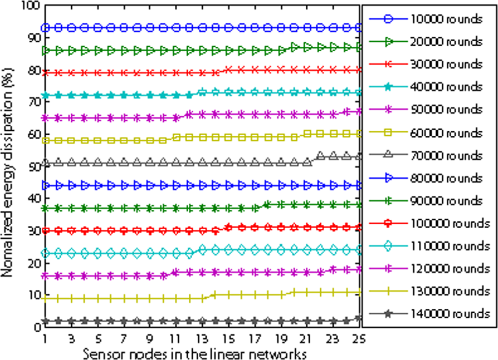 Figure 14 illustrates how well EBH achieves energy balance among individual sensors. We set 25 nodes in the linear network and r is 100 m. From Figure 14, it is shown that all 25 nodes dissipate energy evenly which is the reason for longer network lifetime. We also observe that the nodes far from the sink have a little higher energy. The reason is that the nodes near the sink consume more energy because they will relay more packets than the nodes far from the sink. Therefore, when they consume one grade of energy, they change to low energy consumption mode. At the same time they let upstream neighbor nodes which have higher energy to relay more packets.