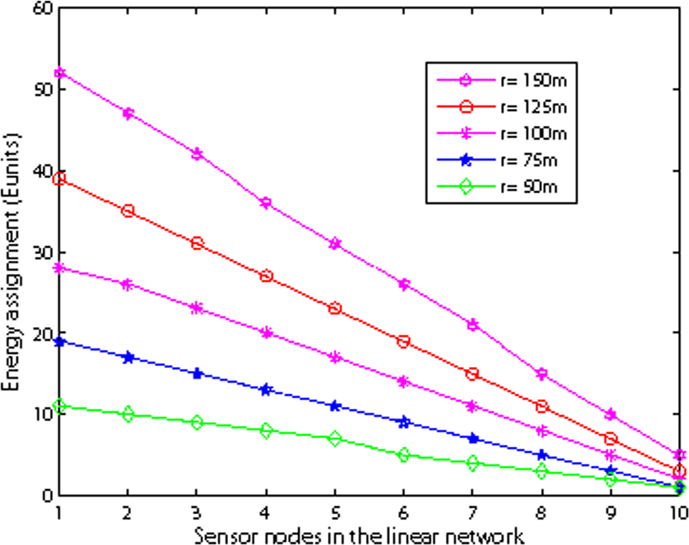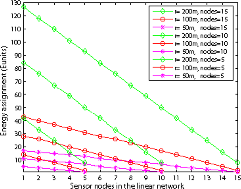 Figure 16 illustrates the energy assignment with different nodes and different internode distances. We observe that as the number of nodes increases, the assigned battery ratio of the first node to the last node increases. This shows that as the number of nodes increases, the first node will relay more packets to the sink, thus its energy consumption increases. However, with fixed internode distance and varying the number of nodes, the slope of the assigned battery line is nearly the same.