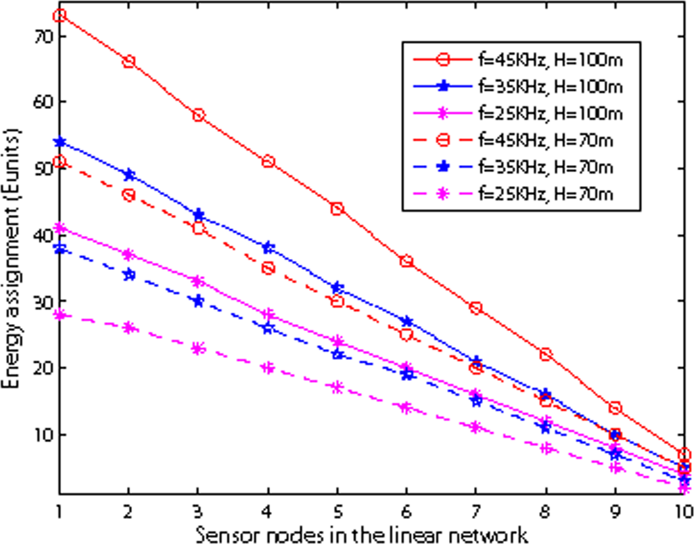 Figure 17 shows the energy assignment with different frequency and depth in shallow water. The total number of nodes is 10, and r is 100 m. It can be seen that both depth of water and the frequency affect on battery power assignment, because as the depth of water or the frequency increases, the energy consumption of nodes increase.