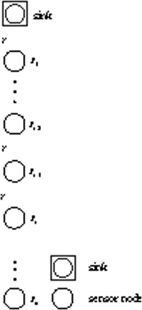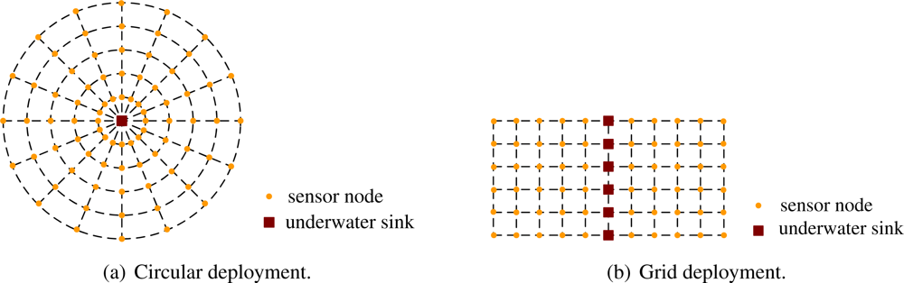 We design two different deployments of sparsely deployed two-dimensional sensor networks as shown in Figure 7(a) and 7(b). In Figure 7(a), the sensors are deployed in a circle. There is only one underwater sink in the circle. In Figure 7(b), the sensors are deployed in a grid. There are many underwater sinks in the grid, and each sink takes charge of a chain where the underwater sink is in the center of it. Using TDMA or CDMA [29, 30], the sensors can send their data to the sink along a chain in which they reside without interference. The underwater sinks directly send collected data to the surface sink using vertical acoustic links.