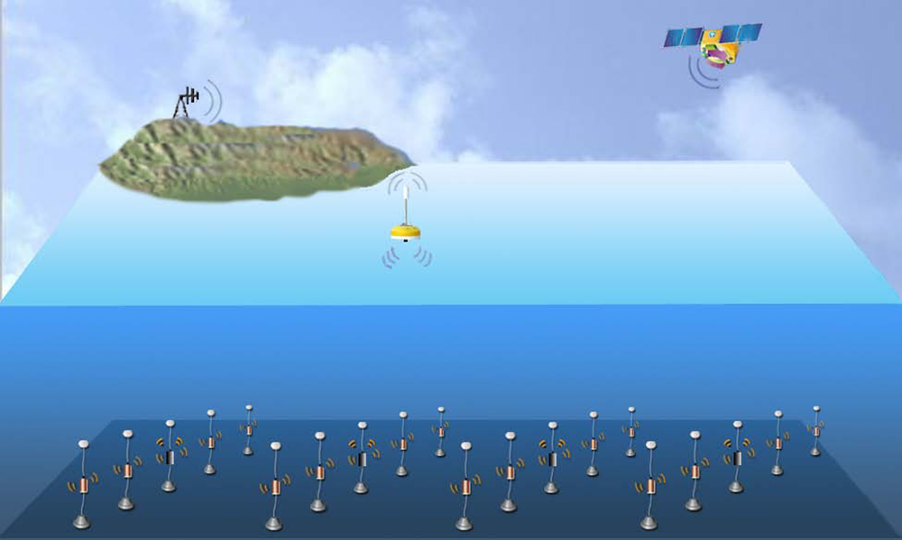 Surface sink node: Surface sink node is attached on a floating buoy with satellite, radio frequency (RF) or cell phone technology to transmit data to shore in real time.