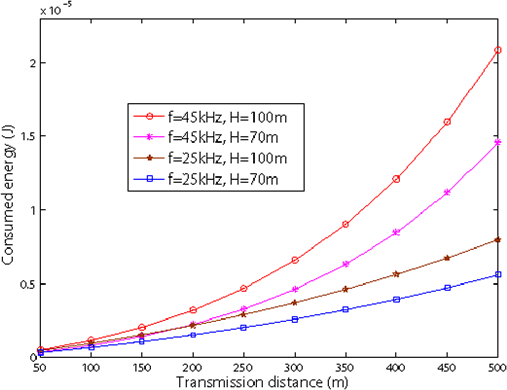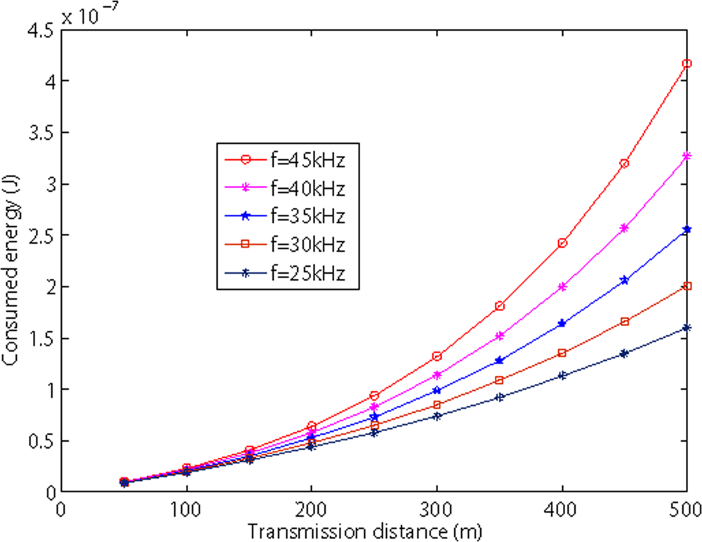 Figures 8 and 9 show the relationship between transmission distance and consumed energy in shallow water and deep sea. Both figures show that as the internode distance increases, the consumed energy increases as well. We also observe from two figures, as the frequency increases, the consumed energy also increases.