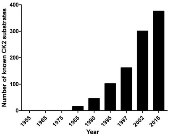 The growing number of proteins phosphorylated by CK2 since its discovery in 1954. Constructed with data from [,,,]. According to PhosphoSitePlus [], the number of phosphosites known to be generated by CK2 is presently 640, which belong to almost 400 proteins altogether.