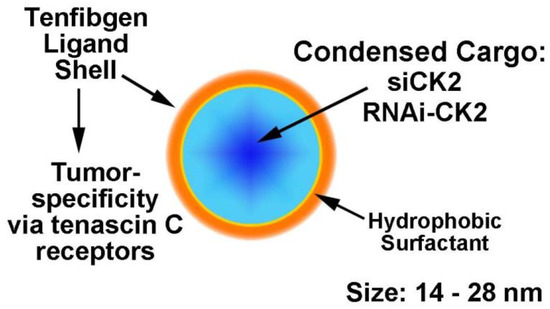 - Unger, G.M.; Kren, B.T.; Korman, V.L.; Kimbrough, T.G.; Vogel, R.I.; Ondrey, F.G.; Trembley, J.H.; Ahmed, K. Mechanism and efficacy of sub-50-nm tenfibgen nanocapsules for cancer cell-directed delivery of anti-CK2 RNAi to primary and metastatic squamous cell carcinoma. Mol. Cancer Ther. 2014, 13, 2018–2029. [Google Scholar] [CrossRef] [PubMed]