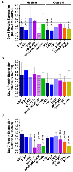 Protein expression response over time to TBG-RNAi-CK2 treatment in PC3-LN4 xenograft tumors. Immunoblot analysis of nuclear and cytosol fractionated PC3-LN4 tumor lysates following intravenous treatments of 0.01 mg/kg TBG-RNAi-CK2 or TBG-RNAi-F7 was performed. Protein signals were quantitated and means and standard deviations are graphed for (A) day 5, (B) day 6, and (C) day 7 following initiation of nanocapsule treatments. Group sizes TBG-RNAi-CK2 n = 3; TBG-RNAi-F7 n = 6 (days 5 and 6) or 7 (day 7). The grey line at expression level of “1” marks the expression for control treated tumors.
