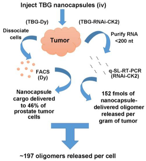 A complimentary analysis was undertaken to quantify the amount of bioavailable oligomer that is released into tumor cells following nanocapsule entry and proteolytic breakdown. In this study, mice carrying PC3-LN4 xenograft flank tumors were injected with TBG-RNAi-CK2 nanocapsules or with a combination of naked RNAi-CK2 oligomer plus TBG-erythritol. The naked oligomer/sugar nanocapsule combination was used to formally test that the RNAi-CK2 oligomers are entering tumor cells due to TBG encapsulation and not due to non-specific association with TBG. Released RNAi-CK2 oligomer was measured in RNA purified from tumor homogenates using quantitative stem-loop reverse transcriptase PCR. The results demonstrated that six of six tumors from mice receiving TBG-RNAi-CK2 contained an average of 152 fmols of released oligomer per gram of tumor. In contrast, none of the six tumors from mice receiving naked RNAi-CK2/TBG-erythritol contained detectable oligomer, indicating the utility and necessity of the TBG encapsulation. Taking the TBG-Dy uptake data together with the oligomer release data, and using the generally accepted value of 109 cells per gram of tumor, we calculate that approximately 197 RNAi-CK2 oligomers were contained per tumor cell. The nanocapsule uptake and oligomer release data from prostate cancer xenograft tumors is summarized in Figure 4.