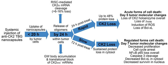 Based on our observations in cultured cells, where precise and/or very short timed effects are more feasible, and in xenograft tumor models, we propose that loss of CK2 holoenzyme proteins and/or enzymatic activity induces cell death in at least two ways. First, acute loss of CK2 function (greater than 30% loss) causes rapid induction of cell death via decreased mitochondrial health, induction of reactive oxygen species (ROS), and loss of survival proteins such as Bcl-xL. Second, sustained but less severe loss of CK2 function over time causes cell cycle arrest, decreased proliferative signaling such as NFκB p65 activation and localization, induction of cell death through loss of survival proteins such as survivin and Bcl-xL, and through caspase 3 activation. This general theory on the function of the TBG-CK2-RNAi nanocapsules as a cancer therapeutic is described in the following flow diagram (Figure 5), and references for this diagram are found here [46,47,48,49,62,63,64,69,70,71,72,73,74,75,76].