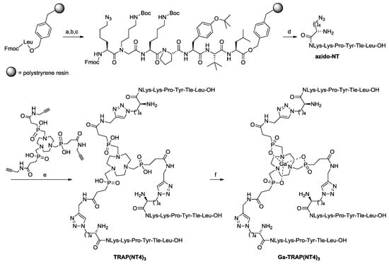 Synthesis of Ga-TRAP(NT4)3, reagents and conditions: (a) Fmoc-deprotection: piperidine/DMF (1:4), μ∼: 5× 5 s, 100 W, 5× cooling to −10 °C; (b) peptide coupling for Fmoc-Tle-OH, Fmoc-Tyr(tBu)-OH, Fmoc-Pro-OH, Fmoc-Lys(Boc)-OH: Fmoc-AA-OH, PyBOP, DIPEA, HOBt, DMF, μ∼, 15× 10 s, 50 W, 15× cooling to −10 °C; (c) for N-Fmoc-N-(4-Boc-aminobutyl)-Gly-OH, Fmoc-Nle(6-N3)-OH: Fmoc-AA-OH, HATU, DIPEA, DMF, μ∼-assisted coupling (see b); (d) deprotection/cleavage of the peptide: TFA/anisole/phenol 83:12:5, reaction time (r.t.), 3 h, followed by RP-HPLC; (e) (1) Cu(OAc)2, sodium ascorbate, H2O/MeOH, r.t., 1 h; (2) NOTA, HCl aq., pH 3, r.t., 10 days, followed by RP-HPLC; and (f) Ga(NO3)3, H2O, r.t., 5 min or [68Ga]GaCl3, HEPES, pH 2.5–3, 98 °C, 5 min.