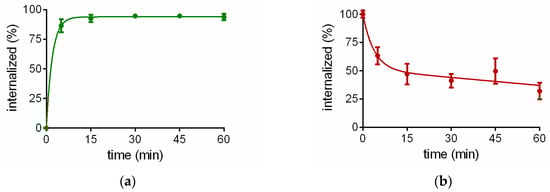 (a) Internalization rate of [68Ga]Ga-TRAP(NT4)3 in HT29 cells in vitro; (b) efflux of [68Ga]Ga-TRAP(NT4)3 from HT29 cells after internalization for 30 min. Each data point represents the mean ± standard deviation of three experiments performed in quadruplicate.