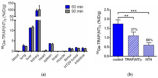 For in vivo evaluation of [68Ga]Ga-TRAP(NT4)3 the NTS1-positive human colorectal adenocarcinoma cells HT29 were injected in nude mice to generate a subcutaneous tumor. The radioligand was injected in the tail vein of the mice and the biodistribution was determined 60 and 90 min after tracer injection. The results are given in Table 2 and Figure 3. While only negligible radioactivity was measured in the blood, the highest uptake values of 55–102 %ID/g were observed in the kidneys and moderate uptake was observed in the liver with values of 11–12 %ID/g at 60 and 90 min post-injection (p.i.). The clearance rate of [68Ga]Ga-TRAP(NT4)3 in these excretion organs was apparently low. Actually, almost no washout or clearance could be seen in any organ besides blood, leading to increasing tumor-to-blood ratios of 13 at 60 min p.i. to 36 at 90 min p.i. The uptake in the tumor was 1.74 %ID/g after 60 min and showed good retention until 90 min p.i. (1.44 %ID/g). Blocking experiments were performed to confirm the specificity of the tumor uptake of [68Ga]Ga-TRAP(NT4)3 in vivo. Therefore, TRAP(NT4)3 (20 nmol) or NT4 (100 nmol) were co-injected together with the radiotracer to define the nonspecific uptake of the tracer in the tumor region. The tumor uptake under these blocking conditions was significantly reduced by 37% with TRAP(NT4)3 and by 66% with NT4 (Figure 3b). Apart from the intestine, the uptake in all other organs was not affected by the blocking substances (Table 2), confirming the receptor-mediated uptake of [68Ga]Ga-TRAP(NT4)3, as it was reported that NTS receptors are expressed in the small intestine of mice [].