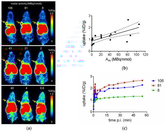(a) Small animal PET scans of three different HT29-bearing nude mice each injected with varying amounts of [68Ga]Ga-TRAP(NT4)3 on three consecutive days, resulting in different molar radioactivities at the time of injection. Depicted are frames from 40 to 60 min; arrows indicate the tumors; (b) HT29 tumor uptake at 50–60 min p.i. expressed as percent of injected dose per g (%ID/g) of [68Ga]Ga-TRAP(NT4)3 dependent of molar radioactivity (Am) of eight mice each scanned two to three times. Given are single data values with the 95% confidence bands for the best fit line; and (c) time activity curves showing uptake of [68Ga]Ga-TRAP(NT4)3 in the HT29 tumor dependent of molar radioactivity in MBq/nmol.
