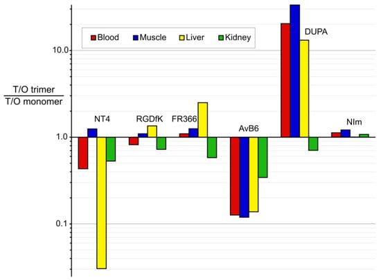 Quotients of tumor-to-organ ratios (T/O) of trimers and corresponding monomers, respectively, for compounds described in Table 3. Values above 1 indicate improvement upon trimerization, while values below 1 translate to deterioration.