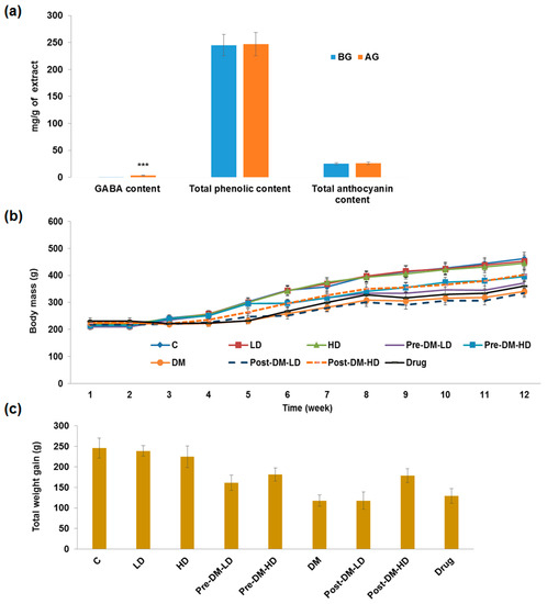 (a) The GABA, total phenolic, and anthocyanin content of germinated and non-germinated black rice. BG: Before germination, AG: After germination. Total phenolic content was represented as mg of gallic acid equivalent (mg GAE) per g of extract. Total anthocyanin content was represented as mg cyanidin chloride equivalent (mg CCE) per g of extract. *** Significant difference (p < 0.001); (b) Effect of GBRE supplements on the body mass of the experimental rats; (c) Total weight gain (total weight gained by the rat at end of the experiment (week 12) from the initial day of the experiment) in experimental rats. C: Control, LD: Low dose of GBRE to naïve rat, HD: High dose of GBRE to naïve rat, DM: Diabetes Mellitus induced rat, Pre-DM-LD: Low dose of GBRE to naïve rat and induced DM, Pre-DM-HD: High dose of GBRE to naïve rat and induced DM; Post-DM-LD: Low dose of GBRE to DM rat, Post-DM-HD: High dose of GBRE to DM rat.