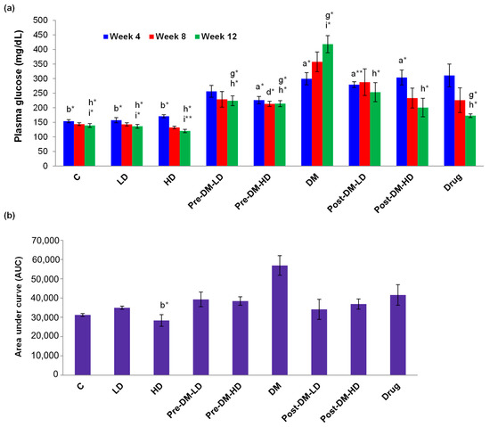 The fasting plasma glucose level of the rats was measured weekly (4, 8, and 12). The level of glucose was higher in DM-induced rats. The fasting plasma glucose level was reduced in the pre-treatment groups during the 8th week of the experimental period. A significant (p < 0.05) reduction in fasting plasma glucose was observed in post-treatment groups when compared with the DM group during the 12th week of the experimental period. The drug treated group also showed significant (p < 0.05) reduction in plasma glucose content when compared with the DM group during the 12th week of the experimental period (Figure 4a). The insulin sensitivity was determined by an oral glucose tolerance test (OGTT). The value of AUC for glucose in OGTT was reduced in both pre-, and post-treatment groups. The AUC for glucose in OGTT was less in the drug-treated group than that of the DM group, but higher than that of the experimental interventions either in pre- or post- treatment (Figure 4b).