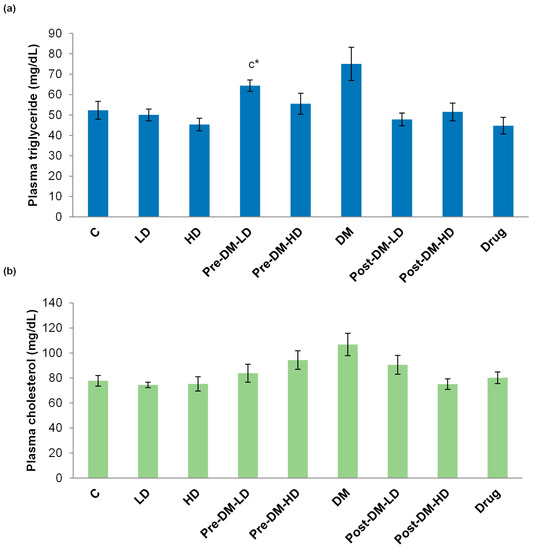The triglyceride (TG) content of the plasma was decreased in the groups upon test interventions when compared with the DM group. The TG value of DM group was 75 ± 8 mg/dL, whereas the low dose of pre- and post-treatment showed only 64 ± 2, and 47 ± 3 mg/dL of TG, respectively. Likewise, the high dose of pre- and post-treatment showed only 55 ± 5, and 51 ± 4 mg/dL of TG, respectively. The drug treatment also reduced the TG content (Figure 5a). The total plasma cholesterol level was notably reduced by the test intervention in pre, and post treatments than that of the DM group. The drug treated group showed 80 ± 4 mg/dL of cholesterol in the plasma (Figure 5b).
