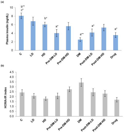 Effect of GBRE supplement on the insulin level (a) and insulin resistance; (b) in the experimental rats. C: Control, LD: Low dose of GBRE to naïve rat, HD: High dose of GBRE to naïve rat, DM: Diabetes Mellitus induced rat, Pre-DM-LD: Low dose of GBRE to naïve rat and induced DM, Pre-DM-HD: High dose of GBRE to naïve rat and induced DM; Post-DM-LD: Low dose of GBRE to DM rat, Post-DM-HD: High dose of GBRE to DM rat. The significant difference between groups (a = when compared with control group; b = when compared with DM group; c = when compared with the drug group) were represented as * (p < 0.05), and ** (p < 0.01).