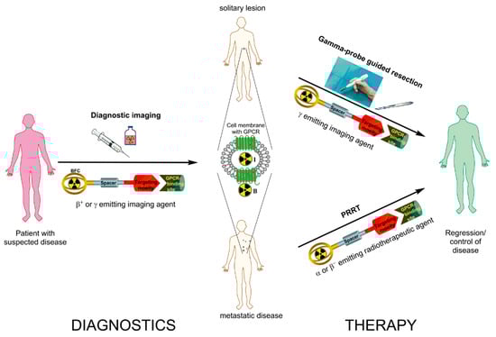 Schematic representation of radiotheranostics using radiolabeled peptides targeting G-protein coupled receptors (GPCR). The radiopharmaceutical consists of the targeting moiety (peptide), a bifunctional chelator (BFC) forming a stable complex with the radionuclide, and often a spacer in between the two units. Radiotheranostics involves diagnostic (left panel) and therapeutic (right panel) components. In targeting of GPCRs (somatostatin receptor (sstr), glucagon-like peptide-1 receptor (GLP-1R), cholecystokinin 2 receptor (CCK2R) or glucose-dependent insulinotropic polypeptide receptor (GIP-R); middle panel) the radiotheranostic agent would bind to GPCR and either internalize into the cell, when utilizing an agonist (I) or stay on the surface of the cell, when utilizing an antagonist (B). In the first step diagnostic imaging using β+ or γ emitting imaging agent to assess the spread of disease is conducted. On the therapeutic stage, in the given example, the patient is subjected either to the gamma-probe guided resection or Peptide Receptor Radionuclide Therapy (PRRT). In radioguided surgery pre-administration of corresponding γ emitting imaging agent gives real-time information to the surgeon and guides the localization of the GPCR rich tumor site intraoperatively. In the case of a metastatic disease α or β− emitting radiotherapeutic agent is administered to target the GPCR rich lesions internally (PRRT).