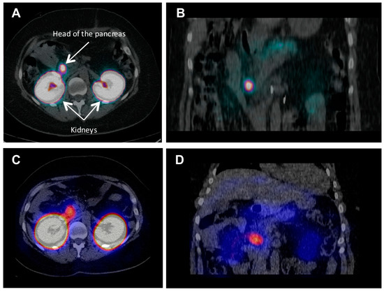 (A) Transaxial and (B) Coronal PET/CT images obtained 2.5 h after injection of 80 MBq [Nle14,Lys40(Ahx-DOTA-68Ga)NH2]-exendin-4; (C) Transaxial and (D) Coronal SPECT/CT images of the same patient obtained 72 h after injection of 92 MBq [Nle14,Lys40(Ahx-DOTA-111In)NH2]-exendin-4. Focal uptake is seen in the head of the pancreas. Courtesy of Dr. Kwadwo Antwi, University Hospital of Basel, Switzerland.