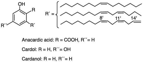 - Suo, M.R.; Isao, H.; Ishida, Y.; Shimano, Y.; Bi, C.X.; Kato, H.; Takano, F.; Ohta, T. Phenolic lipid ingredients from cashew nuts. J. Nat. Med. 2012, 66, 133–139. [Google Scholar] [CrossRef] [PubMed]