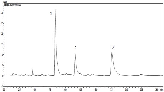 The mixture of anacardic acids, obtained by solvent extraction from crude CNSL, showed, as expected, three main peaks in the HPLC chromatogram (Figure 2), with relative proportions of 3:1:1 for triene (1), diene (2), and monoene (3).