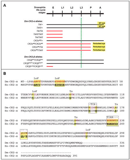 (A) Drosophila life cycle stages and effective lethal phase of CK2 mutants. Abbreviations are; E, Embryo; L1, 1st larval stage; L2, 2nd larval stage; L3, 3rd larval stage; P, pupal stage; A, adult. Note that Dm-CK2-α mutants Tik and TikR arrest at the L1 stage, whereas CK2αMB mutants die at the P-to-A transition. In contrast, CK2βAnd and CK2βmbuP1 are viable, whereas CK2β∆A26 die during embryogenesis. Dashed green line denotes stage of life cycle when eye development initiates; black lines denote normal development, whereas red lines denote effective lethal phases of indicated mutant combinations; (B) Alignment of CK2-α from D. melanogaster (Dm) and H. sapiens (Hs). LoF denotes loss-of-function, whereas Ts denotes Temperature-sensitive. The locations of the Tik and TikR mutations are boxed and yellow highlighting denotes conservation of residues between Dm and Hs CK2α subunits.