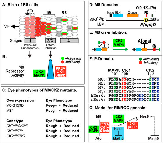 (A) R8 birth; Ato (pink/red), Sens (blue) and secondary R cells (grey); (B) CK2 and Mitogen Activated Protein Kinase (MAPK) activate M8 at stage-2/3 of the MF, and after R8 selection, PP2A and CK1 + Slimb mediate inactivation and/or destruction; (C) Eye phenotypes of CK2 and M8 mutants; (D) Functional domains in M8, and location of the phosphorylation domain (PD) in the C-terminal domain (CtD). The WRPW motif in M8 binds the essential co-repressor Groucho, and M8* (the product of the E(spl)D mutation) eliminates the CtD; (E) Regulation of cis-inhibited M8 by CK2 and MAPK. Note that in cis-inhibited M8, the PD blocks either HLH (blue) or Orange domains preventing interaction with Atonal; (F) Conservation of the PD in Drosophila M8/M5/M7/Mγ and human/mouse Hes6; (G) Model for CK2 regulation of Drosophila M8 and mammalian Hes6. Dotted line denotes non-canonical mode of Hes6 action.