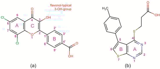 Knowledge about the structural space the enzyme is able to explore and in particular about special local conformations in the proximity of its active site is relevant for ongoing efforts to develop highly potent and selective inhibitors of CK2 which might be beneficial to fight against hematological malignancies [,] as well as solid tumours [,]. Therefore, in this study we emphasize and extend those previous findings on local plasticities with a set of structures of both human CK2α paralogs showing partly extreme structural peculiarities. The structures were obtained by co-crystallization with two potent and selective (within a limited set of test EPKs [,]) ATP-competitive CK2 inhibitors: 4′-carboxy-6,8-dichloroflavonol (Figure 1a), a member of the flavonoid family of CK2 inhibitors [] abbreviated as “FLC21” in the literature [] and inhibiting the CK2α2β2 holoenzyme with an IC50 of 40 nM and a Ki-value of 13 nM [], and 3-{[5-(4-methylphenyl)thieno[2,3-d]pyrimidin-4-yl]thio}propanoic acid (Figure 1b)—referred to as “compound 6a” in its original description [] and “TTP22” in PUBCHEM (pubchem.ncbi.nlm.nih.gov/compound/1536915)—with an IC50 of 100 nM and a Ki of 40 nM [].