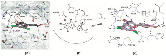 - Golub et al. [] modelled FLC21 bound to CK2α as shown in Figure 2a. This CK2α/FLC21 complex model is based on a set of four predicted ionic, hydrogen bond and π/π interactions (Figure 2b). These interactions were assumed to be formed by the B and the C-ring of the flavone framework and its substituents whereas the A-ring with the two chloro atoms were supposed to be not involved.