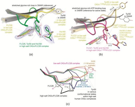For FLC26 these observations were rationalized with the two aforementioned complex structures 4UB7 and 4UBA []. One of these structures—obtained from high-salt crystallization conditions—showed a π-halogen bond between the Br8-atom and the aromatic ring of the Tyr50 which was only possible after a dramatic conformational change of the ATP-binding loop (Figure 3a). With low-salt crystallization conditions this π-halogen bond was absent in the crystalline state but kinetic studies [] suggested that it nevertheless contributes to the inhibitory efficacy of FLC26 in the solute state.