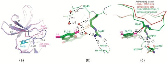 This is a non-functional state of the ATP-binding loop because the Arg47 side chain interferes with the ribose region of the canonical ATP site (Figure 4a). FLC21 seems to support this local conformation since it is present in the two FLC21 complex structures with CK2α′Asp39Gly/Cys336Ser (No. 1 and 2 in Table 1) as well albeit with more internal flexibility, i.e., less well defined electron densities. So far this “Arg47-down” conformation did not occur in complexes with FLC26; if this reflects a significant difference between FLC21 and FLC26 (which cannot be clarified currently due to the limited number of complex structures with FLC26), this would be surprising because it is the Cl8 atom of FLC21 that is in atomic contact to the Arg47 side chain (Arg48 in CK2α′) and because bromine—the Cl8 equivalent in FLC26—generally forms stronger halogen bonds than chlorine [].