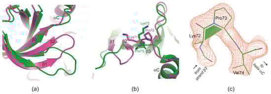 In this context the C-terminal part of the neighbouring strand β3 is particularly critical. Here, the final residue Lys72 (Lys71 in CK2α) normally stabilizes the functional conformation of the ATP-binding loop first by a β-sheet-typical main chain/main chain hydrogen bond and second by stretching its side chain over the strand β2 as visible in Figure 5b. Without these contacts Lys71/72 is free for structural alternatives. It can even force its extended side chain into a completely different direction (Figure 5b) which is accomplished by a cis-peptide bond with the succeeding proline residue, the central residue of the β3/αC loop (Figure 5c). A cis-peptide bond at the equivalent position was observed only once before, namely in a CK2α1–335 structure with a cyclic peptide bound to the CK2β interface []. Here, it occurs—well documented by electron density (Figure 5c)—in protomer B of the CK2α′Asp39Gly/Cys336Ser/FLC21 complex structure, i.e., for the first time with CK2α′ and remarkably enough in correlation with a novel halogen bond (Figure 4c) and with the strongest ATP-binding loop deviation in any CK2α/CK2α′ structure obtained so far under low-salt crystallization conditions.