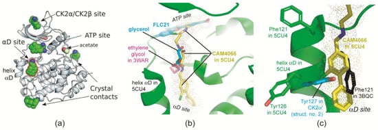 Most interesting is a novel “αD site” behind the small helix αD (Figure 6a) and with access to the ATP site. Brear et al. [] noticed that ethylene glycol can occupy the entrance region of the αD site (found in PDB 3WAR []) and exploited all findings about molecular fragments to design the bivalent CK2 inhibitor CAM4066. CAM4066 occupies the ATP site and the αD site simultaneously (Figure 6b). An overlay of a CK2α/CAM4066 co-crystal structure (PDB 5CU4) with chain B of the monoclinic CK2α′Asp39Gly/Cys336Ser/FLC21 reveals that the aforementioned glycerol molecule is attached to the connecting path between the two sites (Figure 6b). Thus, it supplements the set of molecular fragments that can be combined to similar bivalent inhibitors.