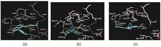 Like FLC21, TTP22 (Figure 1b) was theoretically docked to CK2α in the original description of the compound []. The carboxy group of the TTP22 molecule was assumed to form hydrogen bonds to Lys68 and to Asp175 (Figure 7a) in a similar way as FLC21 (Figure 2a). A further predicted anchor point was the N1-atom within the pyrimidine ring A which was supposed to be hydrogen bonded to the hinge backbone (Val116). The thienopropionic acid substituent has an optimal length to allow all three hydrogen bonds simultaneously []. In this orientation the aromatic substituent of the B-ring points to the solvent but is nevertheless flanked by some hydrophobic side chains as visible in Figure 7a.
