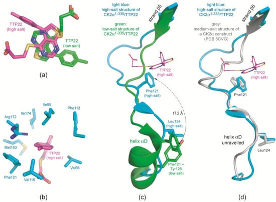 A conspicuous feature in Figure 8b is the fact that Phe121 is part of the hydrophobic cage around the methylphenyl substituent of TTP22. This is quite surprising because it requires a movement of Phe121 by more than 17 Å compared to the low-salt CK2α1–335/TTP22 complex (Figure 8c). In this low-salt structure Phe121 has its typical and well known position of an open hinge/helix αD conformation while Tyr126 occupies—also quite usual—the catalytic spine cavity (i.e., the αD site according to Brear et al. []). According to all experiences obtained so far (see in particular the analysis of Klopffleisch et al. []) a change to a high-salt medium should induce a switch to the closed hinge/helix αD conformation in which Phe121 completes the catalytic spine and harbours its side chain in the αD site (see black side chain in Figure 6c).