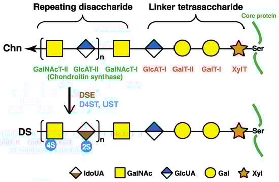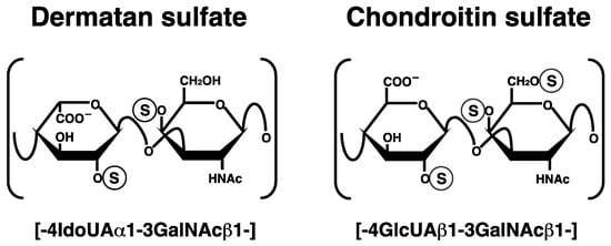 Dermatan sulfate (DS) is a linear polysaccharide that has been classified as a sulfated glycosaminoglycan, which is covalently attached to the core proteins of proteoglycans (PGs) [1,2,3,4]. PGs are widely distributed in extracellular matrices and at cell surfaces [1,2,3,4]. DS-PGs exist abundantly in skin, cartilage, and the aorta. Furthermore, they are ubiquitously expressed in various tissues such as brain, liver, lung, kidney and heart. DS chains consist of alternating disaccharide units comprising L-iduronic acid (IdoUA) and N-acetyl-d-galactosamine (GalNAc) residues with 50–200 repeats (Figure 1). DS chains are modified by sulfation at the C-2 and C-4 positions on IdoUA and GalNAc residues, respectively, which is a structural fundament to a wide range of biological events involving DS such as the assembly of extracellular matrices, signal transduction through binding to growth factors, wound healing, and anti-coagulation [2,3]. Chondroitin sulfate (CS) is composed of D-glucuronic acid (GlcUA) and GalNAc. After the synthesis of the chondroitin backbone, the GlcUA residue is epimerized to IdoUA by DS-epimerase (DSE). Thus, the content of IdoUA or DS is varied in each organ or developmental stage. CS-DS hybrid chains are also formed in specific cells and/or tissues.